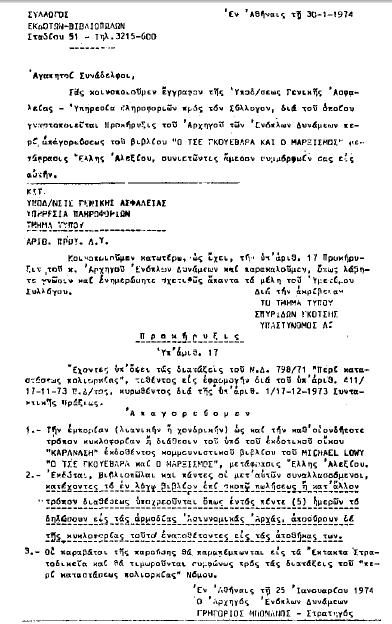 Αθήνα, Ιανουάριος 1974. Ο Σύλλογος εκδοτών βιβλιοπωλών κοινοποιεί… διαταγή της Γενικής Ασφάλειας και του Αρχηγού των Ενόπλων Δυνάμεων γιά την απαγόρευση κυκλοφορίας του βιβλίου του Μισέλ Λεβί «Ο Τσε Γκεβάρα και ο Μαρξισμός».