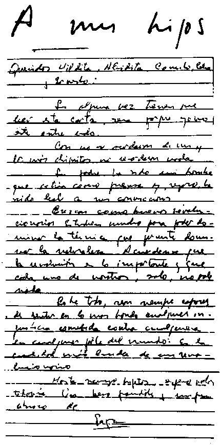 Μεγαλώστε ως καλοί επαναστάτες. Μελετήστε σκληρά ώστε να εντρυφύσετε στην τεχνολογία, η οποία μας επιτρέπει να δαμάσουμε τη φύση. Να θυμάστε ότι η επανάσταση είναι το σημαντικό – και ο καθένας από εμάς μόνος δεν αξίζει τίποτα.