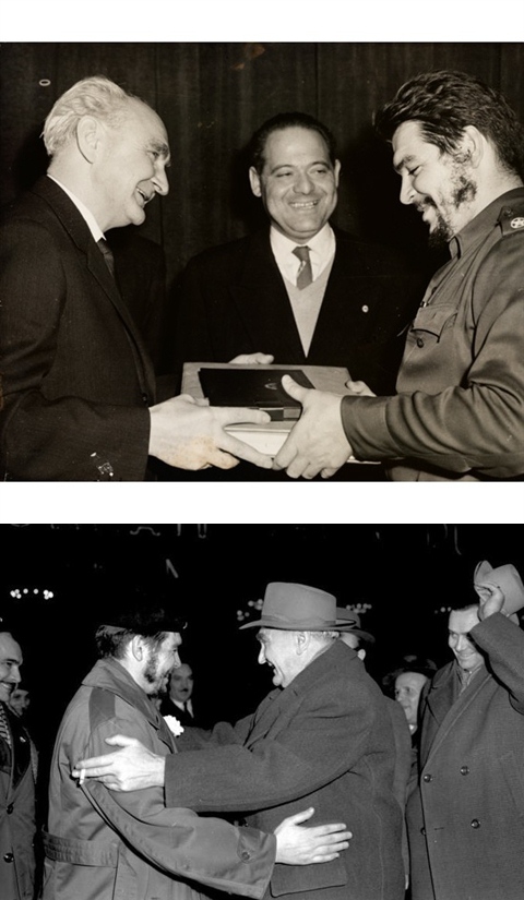 Στιγμιότυπα από δύο διαφορετικές επισκέψεις του Τσε Γκεβάρα στο Ανατολικό Βερολίνο της Λ.Δ. της Γερμανίας. Στην πρώτη (1959) ο Τσε βραβεύεται από τον τότε πρόεδρο Βάλτερ Ούλμπριχτ. Στη δεύτερη φωτογραφία (1960) γίνεται δεκτός από τον Χάϊνριχ Ράου, κορυφαίο στέλεχος του Ενωμένου Σοσιαλιστικού Κόμματος της Γερμανίας και υπουργό Εμπορίου την εποχή εκείνη.