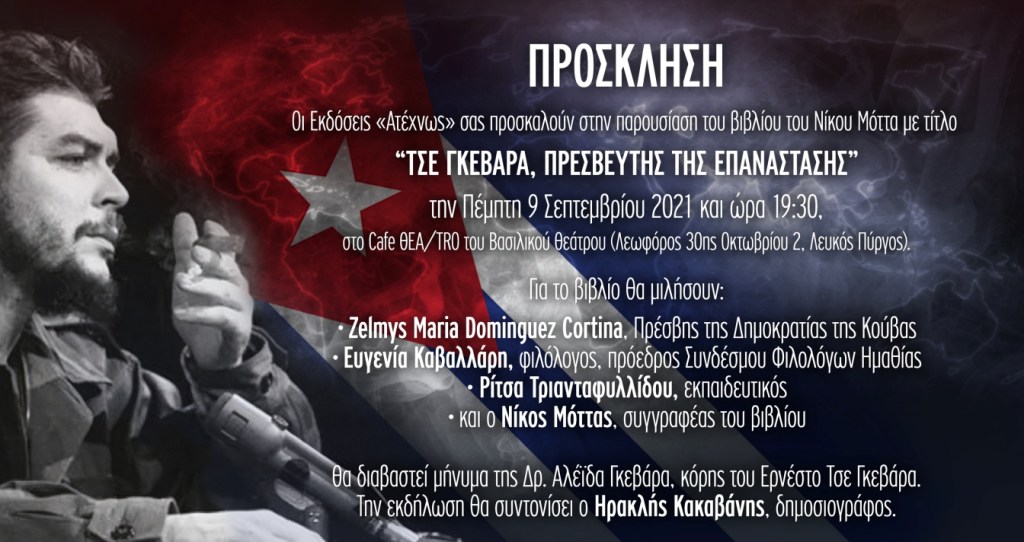 Την Πέμπτη 9 Σεπτεμβρίου στις 7.30 μ.μ, στο Cafe Θεα/τρο του Βασιλικού Θεάτρου (Λεωφόρος 30ης Οκτωβρίου 2, Λευκός Πύργος), θα γίνει η παρουσίαση του βιβλίου των εκδόσεων «Ατέχνως», που υπογράφει ο Νίκος Μόττας, με τίτλο «Τσε Γκεβάρα, πρεσβευτής της Επανάστασης».