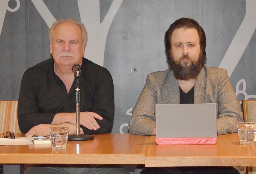Nikos Mottas (right) with journalist Alekos Chatzikostas.